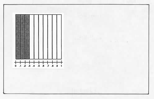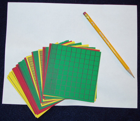 | Ask each person to select a red square and carry out the following steps (see illustration below): 1. Turn a standard sheet of paper lengthwise and place the square near the left edge as shown below. 2. Use the bottom edge of the square to draw a line and place a mark on the line for each of the 11 vertical lines of the square. 3. Label the left end point 0 the right end point 1 and write the decimal for the square under the mark which is at the end of the shaded part of the square. For example this is .3 for the square below. Place other decimal squares above the line and write the decimal for their shaded amounts. 4. When the unit length from 0 to 1 has been labeled with decimals for tenths measure the length of some small objects such as an eraser Decimal Playing Card etc. Discuss the use of decimals to tell what part of a region is shaded (area) or to tell the distance (length) a point is from the zero point. |