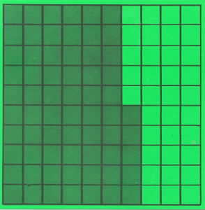 | Discuss the following: (a) Decimals for the red squares have only one place because the number of shaded parts is a single digit number. Ask people to count by tenths . . . .9 and put a red square for .9 on the overhead to show that the next number after .9 when counting by tenths is 1.0 for a whole square and zero tenths. Discuss the tendency for students to write .10 following .9 but that the squares can be used to show that .10 is equal to .1 by using squares with 10 shaded parts out of 100 and 1 shaded part out of 10. |