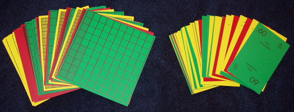 | Here are a few possibilities: the cards are colored coded to match the squares; and there is a decimal for each square. Point out that the color coding helps to provide a gradual transition to the use of decimals because the color suggests the total number of parts in a square and the student only needs to look at the whole number part of the decimal to determine the number of shaded parts for the square. | ||||||||||||||||||||||||||