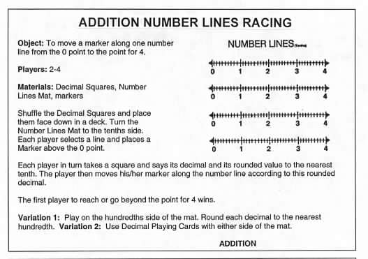 one for addition (see rules below) and one for subtraction. These games are on pages 83 and 87 of the Decimal Squares Teachers Guide. Show a transparency of the Number Lines from the end pages of the Decimal Squares Teachers Guide and briefly illustrate one or two moves in the game. |